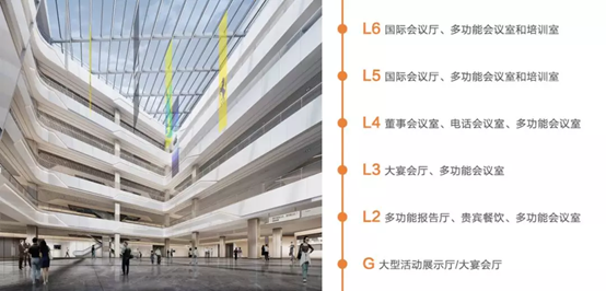 GYICC整体会议空间高达17,000平方米,拥有可组合的宴会厅、多功能报告厅、国际会议厅、多功能会议室、贵宾室共计70间,最多可容纳13,000 人同时开会。会议中心共建六层,每一层都配置了不同规格和功能的会议室,拥有宽敞的公共区域,适合同时举办各种类型的会议活动。
