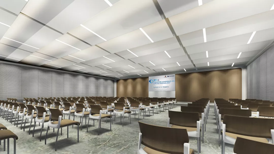 多功能报告厅位于GYICC二层,同样9米层高,设有505个座位的可伸缩式阶梯座椅,适合举行各类研讨会、音乐会、文艺演出等。“多功能”三个字在这里得到完美诠释,当座椅全部收起后,多功能报告厅摇身一变,成为500平方米中型无柱式会议厅。
